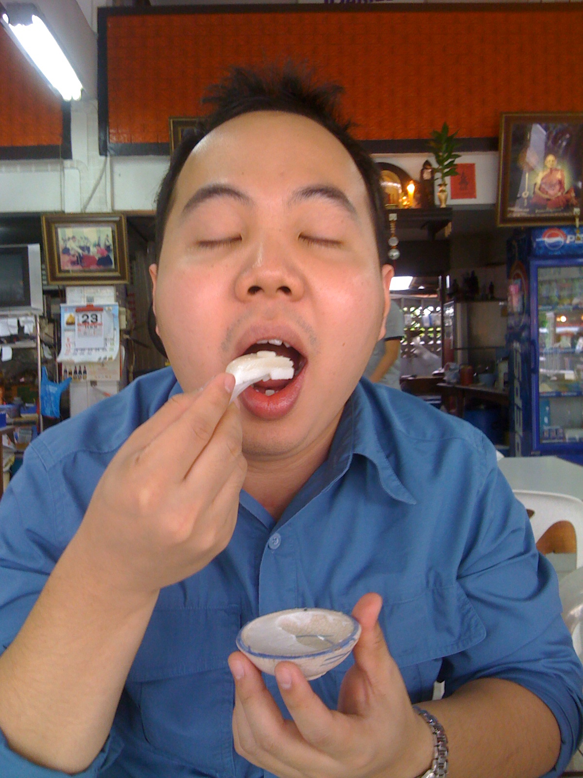 คราวนี้ลัดมาทางเอ็มโพเรียมบ้าง เนื่องจากต้องไปสอนทรัมเป็ต ไปซ้อมแถวนั้นเป็นประจำ เลยต้องหาไรทานบ้าง ร้านนี้ครับ ดังมาก มีดีที่น้ำจิ้มอีกแล้ว ปรุงรสกำลังพอดี มักจะหมดตอนสองทุ่ม แต่วันที่ทานเนี่ย ฝนตกเลยได้ทานครับ อิอิ