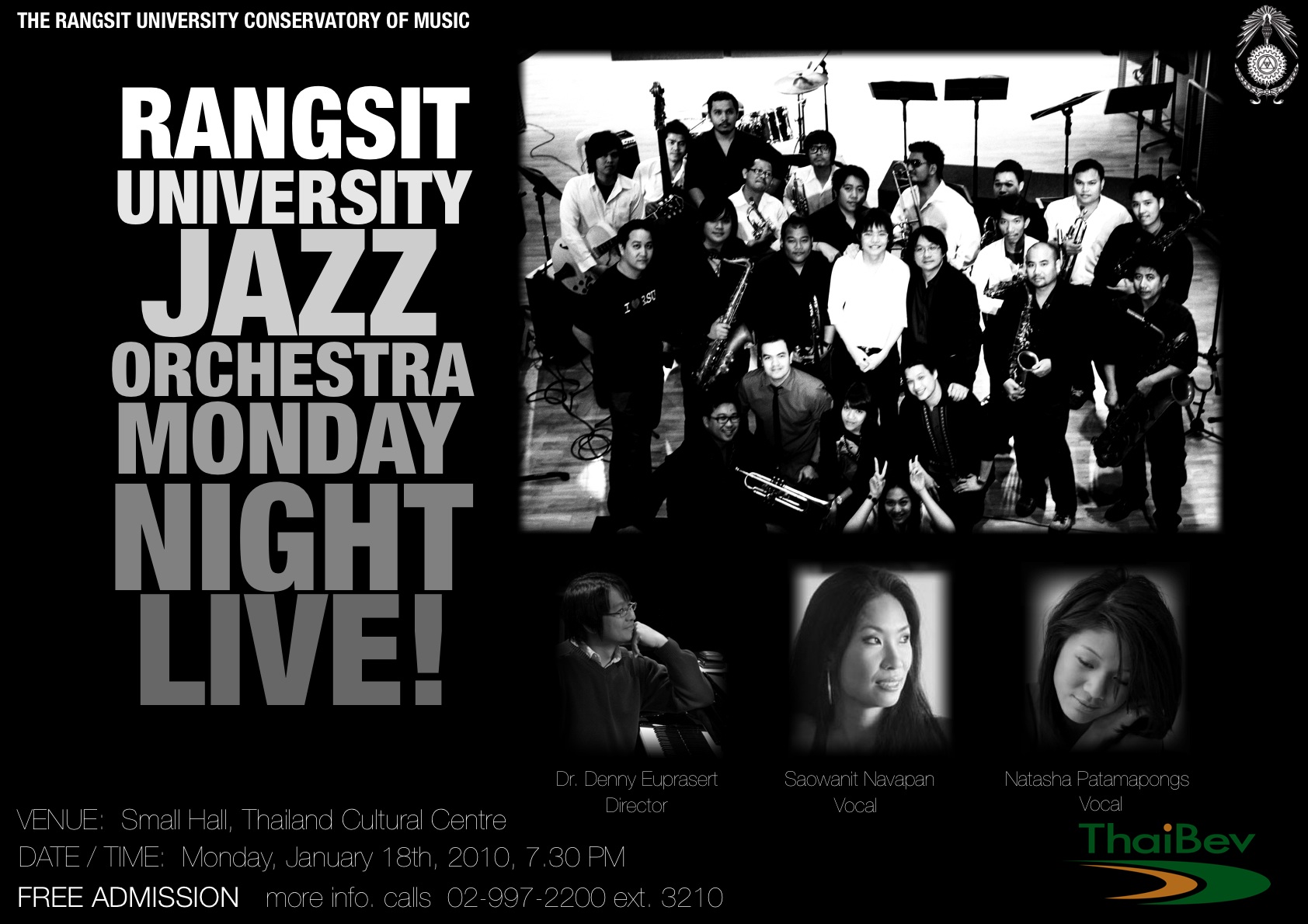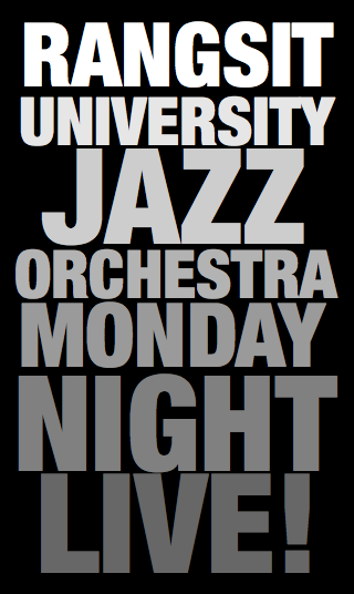 จันทร์ที่ 18 นี้แล้วนะครับ (18 ม.ค. 2010) กับ คอนเสิร์ตบิ๊กแบนด์จากภาควิชาแจ๊ส วิทยาลัยดนตรี มหาวิทยาลัยรังสิต ณ หอประชุมเล็ก ศูนย์วัฒนธรรมแห่งประเทศไทย เริ่มเวลา 19.30-21.30 น. ครับ แวะเอาโปสเตอร์ และสูจิบัตร ล่าสุดมาฝากครับ