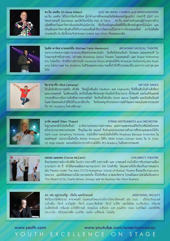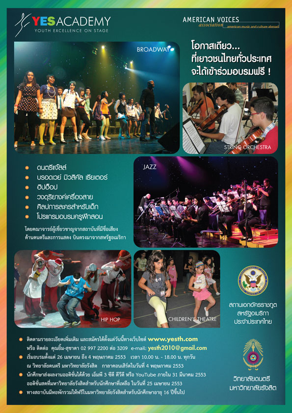 หลังจากประสบความสำเร็จกับโครงการ Youth Excellence on Stage หรือ YES Academy ในเดือนตุลาคมปีที่แล้ว เรากลับมาอีกครั้งด้วยโปรแกรมใหม่ที่น่าสนใจมากขึ้นกว่าเดิม 26 เมษายน ถึง 4 พฤษภาคมศกนี้ จะเป็นช่วงเวลาที่เด็กไทยจากทุกภูมิภาคทุกจังหวัดจะได้มีโอกาสแสดงศักยภาพของตนเองอย่างเต็มที่ในการเรียนรู้ศิลปวัฒนธรรมของอเมริกันโดยไม่ต้องเสียค่าใช้จ่ายใดๆ ด้วยความอนุเคราะห์ของสถานเอกอัครราชทูตสหรัฐอเมริกาประจำประเทศไทย และมหาวิทยาลัยรังสิต