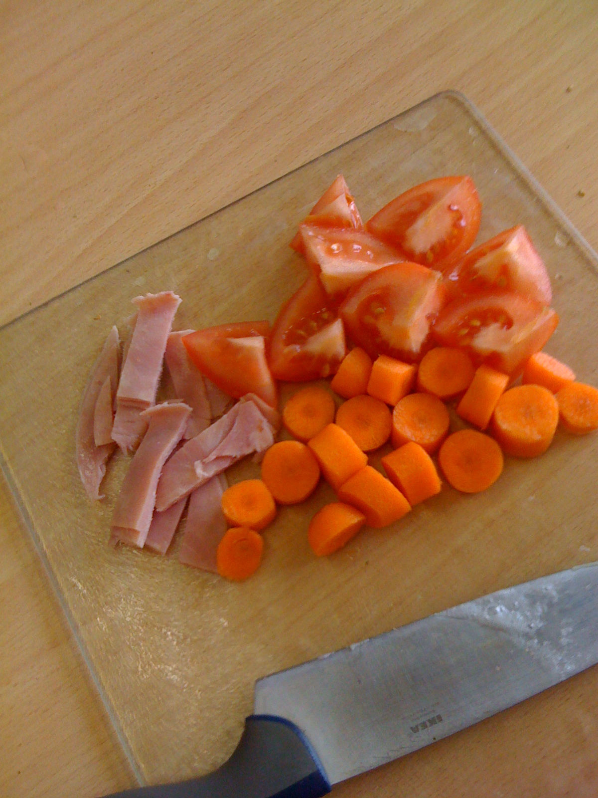 หั่นผักรอ มีหอมหัวใหญ่ มะเขือเทศ แครอท แล้วก็ขี้โกงซื้อผักรวมมาสองถุง ถุงนึงมีเห็ด อีกถุงมีพริกใหญ่กับซูกีนี่ เอามารวมๆ กัน เพิ่มรสชาด