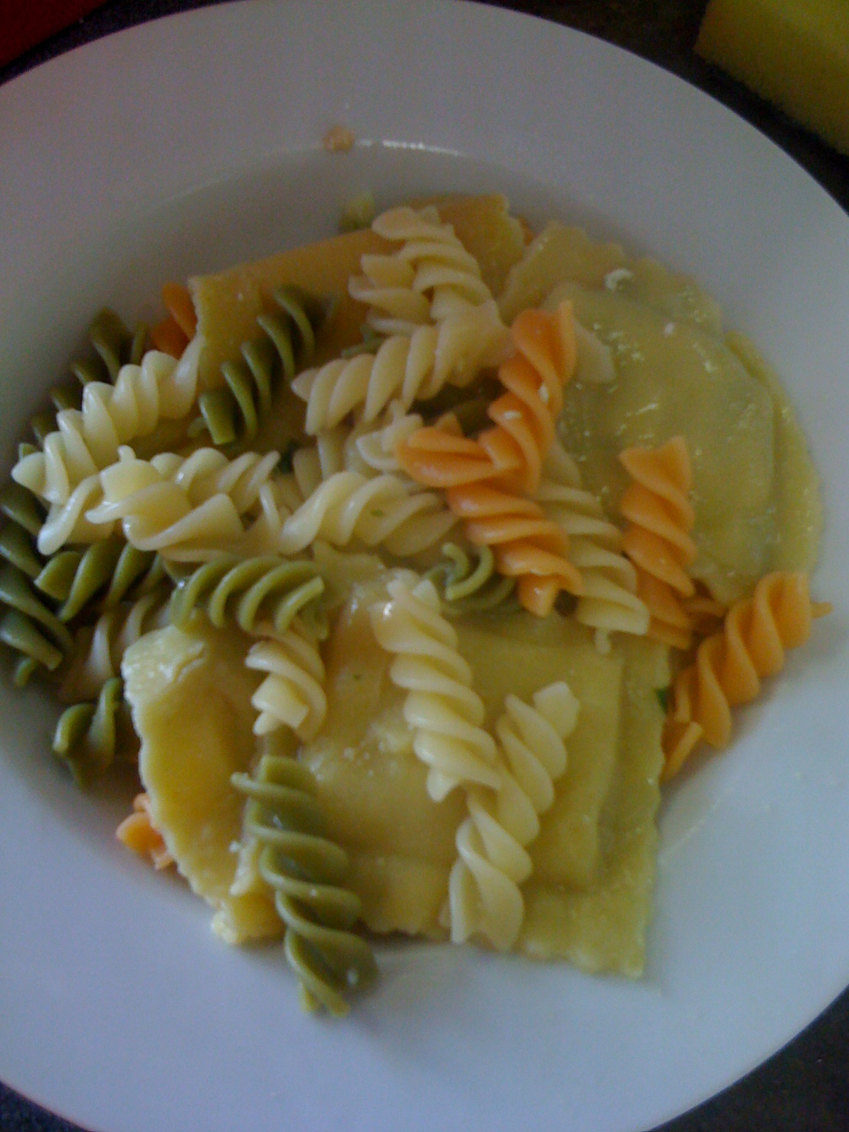 หลังจากได้เกี๊ยวแล้วก็ซื้อ Presto มาด้วยเลย เลือกตัว Chilli มาเลย พอเห็นสี ก็โอ้ว ทำผัดใบกะเพราดีกว่า เพราะได้ Thai herb มาด้วย (มีห้าชนิดรวมกัน ไม่รู้ว่าอะไรบ้าง) เอามาผัดแต่ไม่ใช้หมด ไม่เปลืองดี จะได้โชว์ฝีมือด้วยครับ เริ่มจากต้มเส้น ใส่ฟูซิลี ก่อนเพราะสุกช้ากว่า อีกสองนาทีค่อยตามด้วยเกี๊ยว