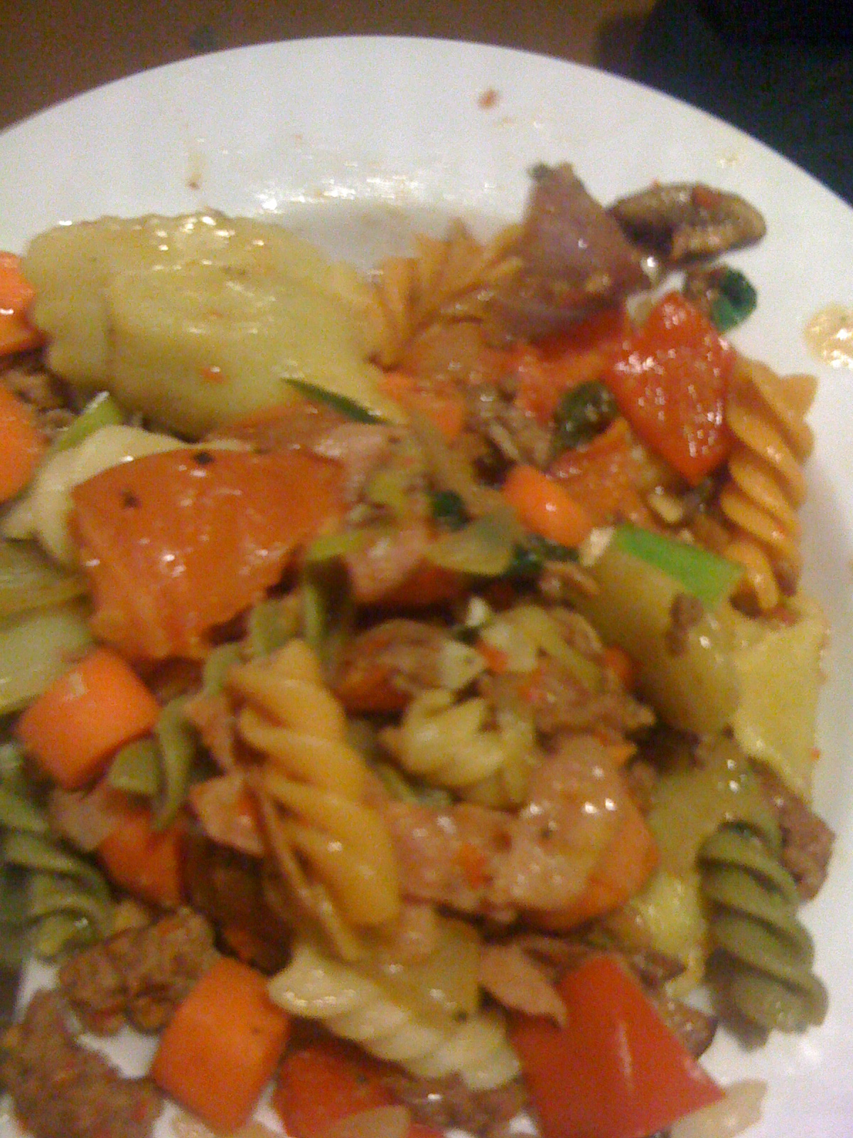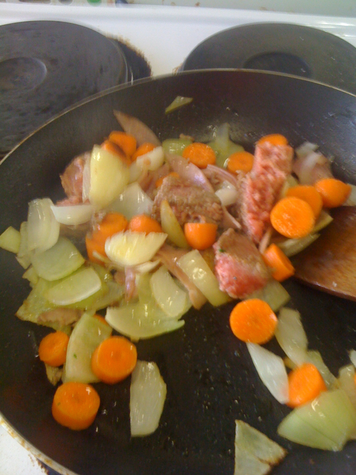เสร็จแล้วก็เริ่มผัดโดยใส่หอมใหญ่ ผัดให้หอมก่อน แล้วตามด้วยเนื้อสับ กับหมูสับ ใส่แครอท แล้วเติมน้ำนิดหน่อย ให้หมูเนื้อพอรวนได้ แล้วค่อยใส่ผักรวมลงไป ผัดต่อ ปรุงรสด้วย Sea Salt (แทนน้ำปลาละกัน), พริกไทย, กระเทียมแห้ง, ผงเครื่องเทศไทย (เห็นละน่าจะเป็นต้นหอม แล้วก็อะไรไม่รู็แล้ว) คนให้เข้ากัน แล้วใส่เส้นเกี๊ยวสุดท้ายเลย