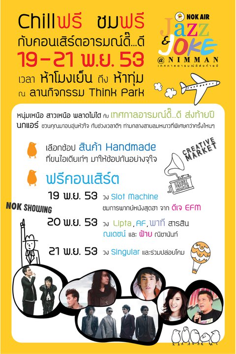 Nok Air: Jazz & Joke @ Nimman…..Chill ฟรี ชมฟรี กับคอนเสิร์ตอารมณ์ดี๊…ดี 19-21 พ.ย. 53 เวลา ห้าโมงเย็น ถึง ห้าทุ่ม ณ ลานกิจกรรม Think Park ถนนนิมมาน เชียงใหม่